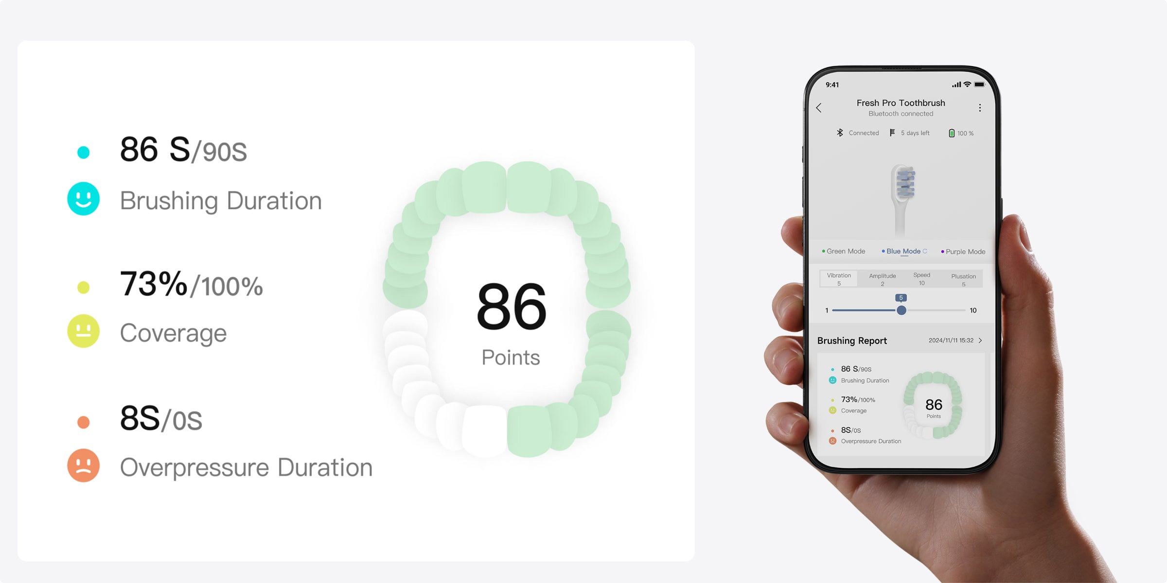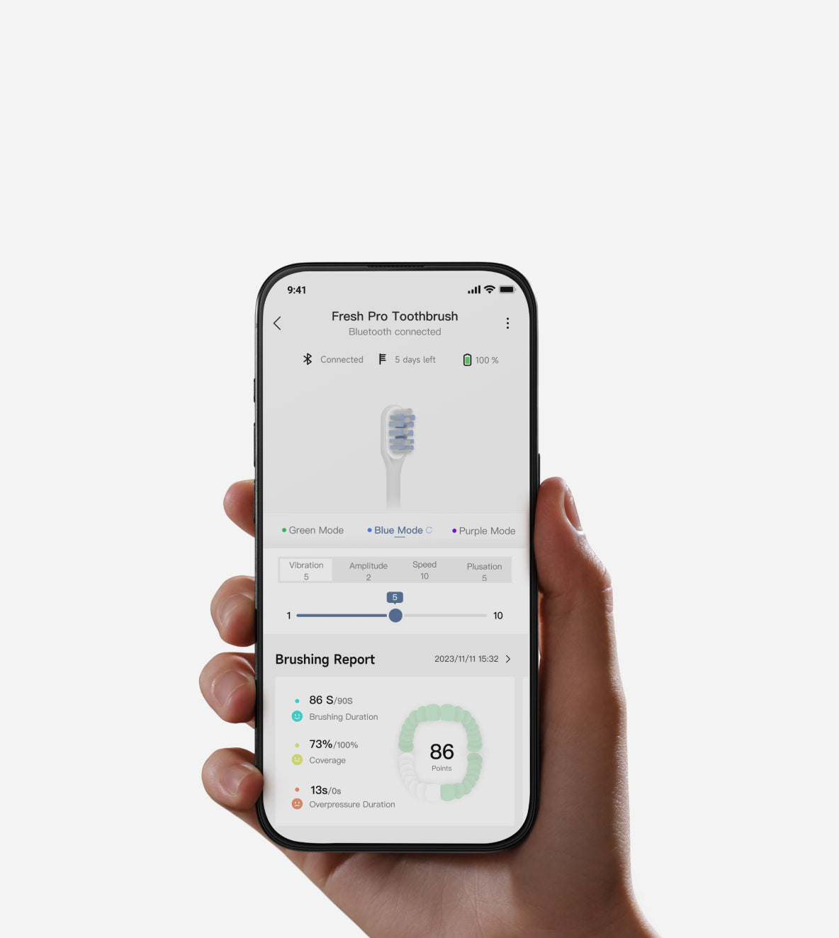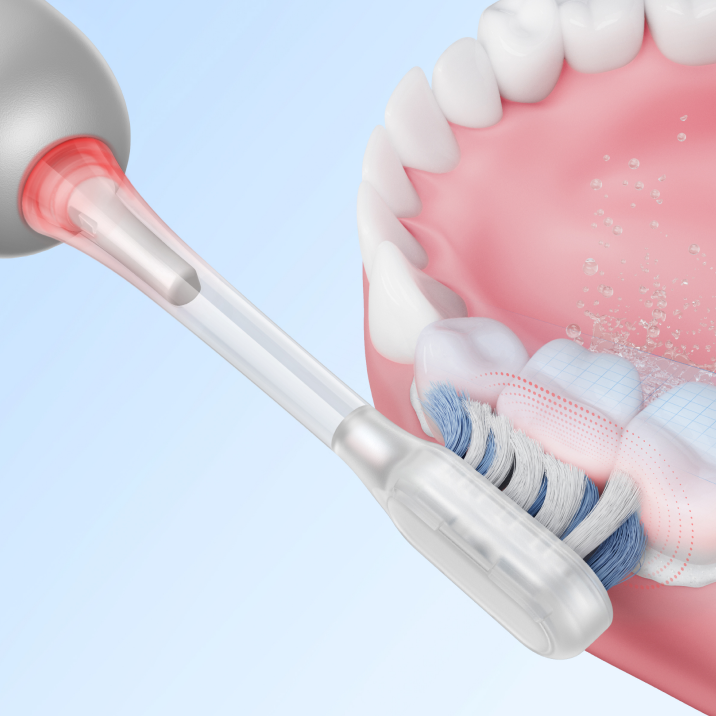Dantų šepetėlis pats sureguliuos spaudimą naudodamas Smart Light Ring. Jis mirksi raudonai ir automatiškai sumažina vibraciją, taip apsaugodamas dantis ir dantenas nuo pažeidimų.