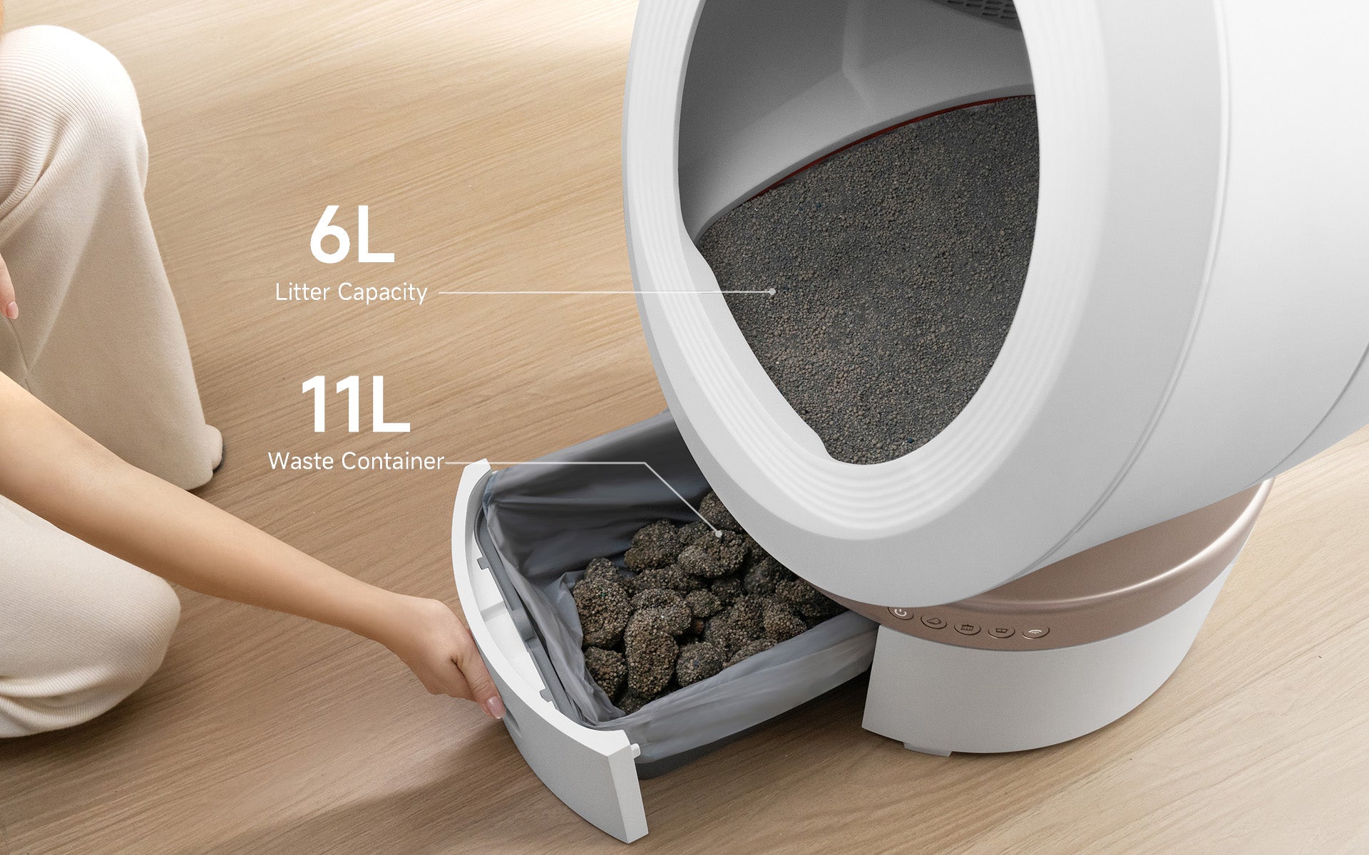 Viršuje esanti rankena suteikia galimybę iškelti korpusą vienu paprastu judesiu. Plastikinį apvalų korpusą ir panaudoto kraiko surinkimo dėžutę galima per kelias sekundes išplauti, paskui greitai įdėti atgal nesiliečiant rankomis su kačių išmatomis.
